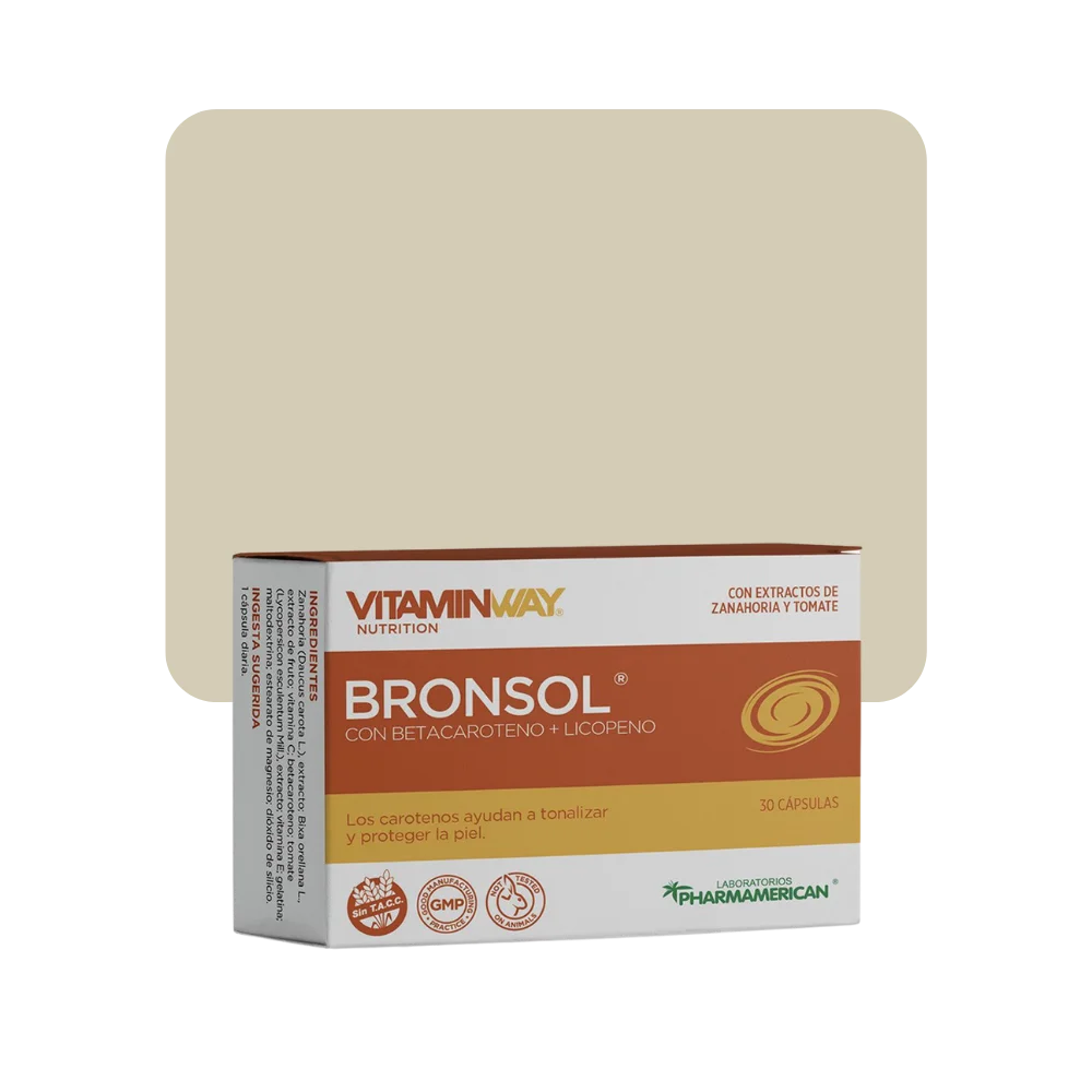 Bronsol Vitamin Way® es un suplemento que estimula el bronceado con carotenos vegetales, protegiendo la piel durante la exposición al sol. Sus nutrientes antioxidantes proporcionan una protección fotoprotectora oral.