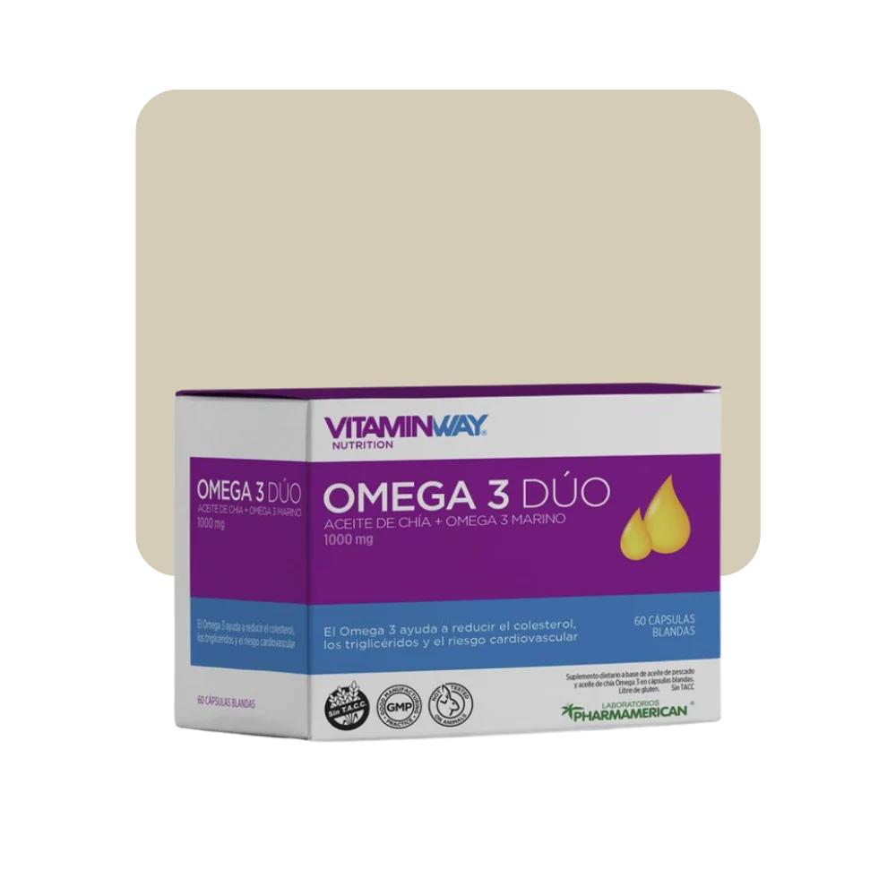 El suplemento nutricional Omega 3 DÚO Vitamin Way® combina Omega 3 de origen vegetal con Omega 3 marino para reducir el colesterol, los triglicéridos y el riesgo cardiovascular. Una cápsula blanda aprovecha todos los beneficios individuales de ambos aceites.