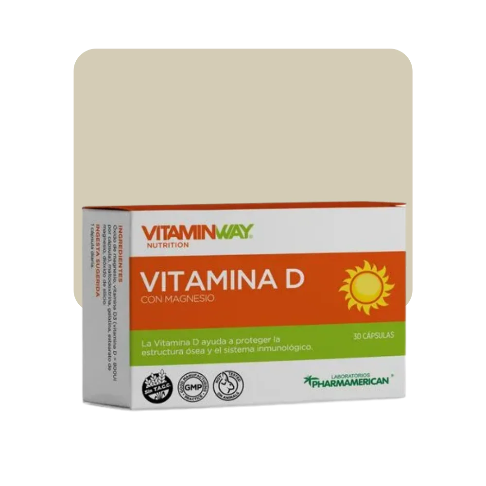 El suplemento nutricional Vitamina D Vitamin Way® ayuda a fortalecer la estructura ósea y colabora con la respuesta del sistema inmunológico. La Vitamina D participa activamente en la regulación del calcio y fósforo, necesarios para mantener los huesos saludables. Además interviene en numerosos procesos fisiológicos, especialmente en relación con las defensas del organismo. El magnesio actúa como cofactor activador de la vitamina D para optimizar su función y beneficios.