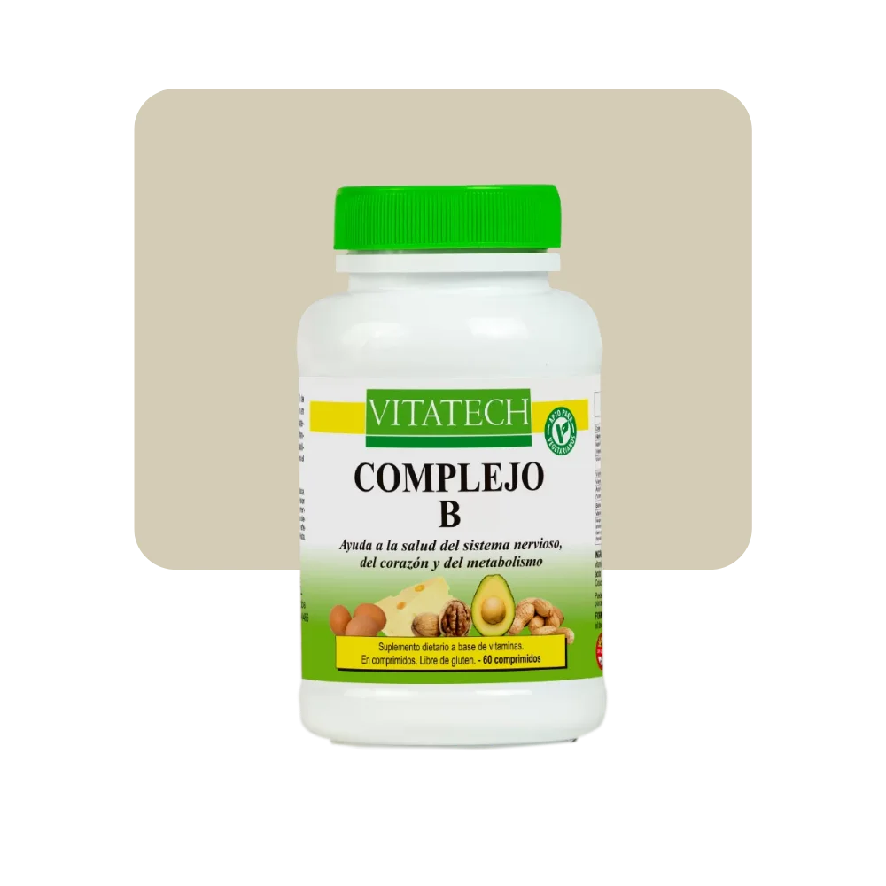 El Complejo B de Vitatech reúne una variedad de vitaminas esenciales del grupo B para promover la salud cardiovascular y nerviosa.