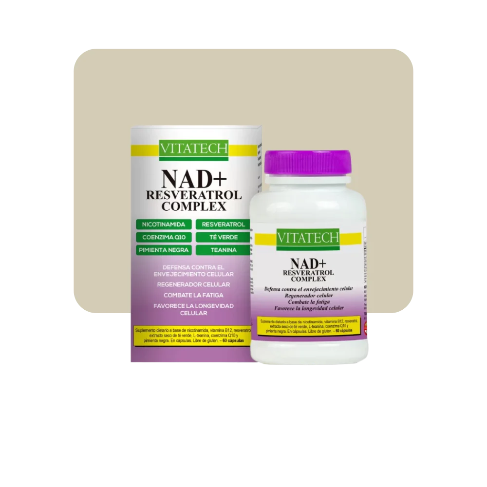 VitaTech NAD+ Resveratrol Complex une ambos activos en una fórmula pensada para potenciar la energía, la claridad mental y la salud celular desde adentro.