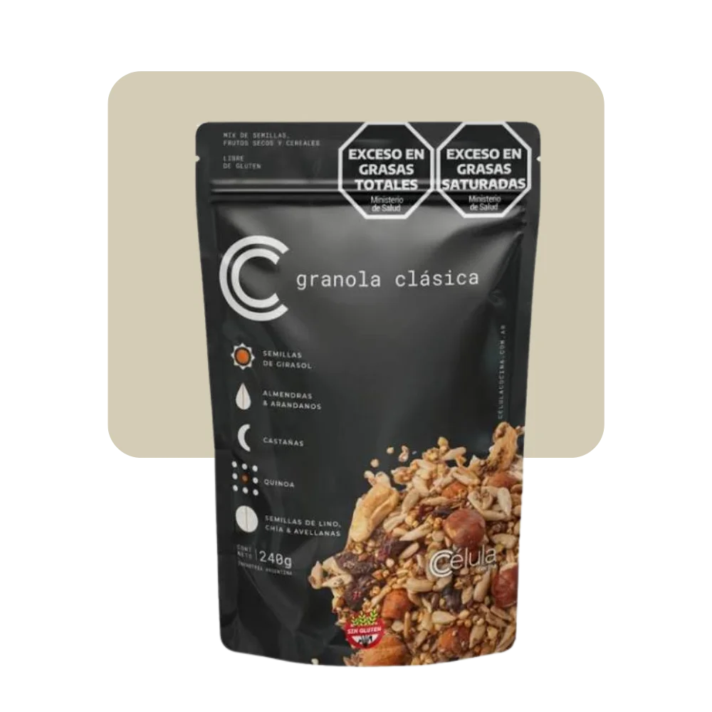 Esta granola de Célula Cocina está formulada con ingredientes como proteína vegetal, trigo sarraceno, semillas (chía, lino, girasol), coco, frutos secos y arándanos, logrando una mezcla rica en texturas y nutrientes.