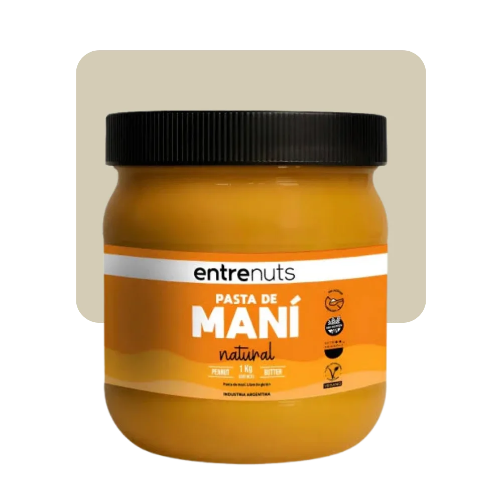 Esta pasta de maní de Entre Nuts está hecha exclusivamente con maní tostado, sin azúcar agregada, conservantes ni aceites hidrogenados, manteniendo un perfil simple y natural.